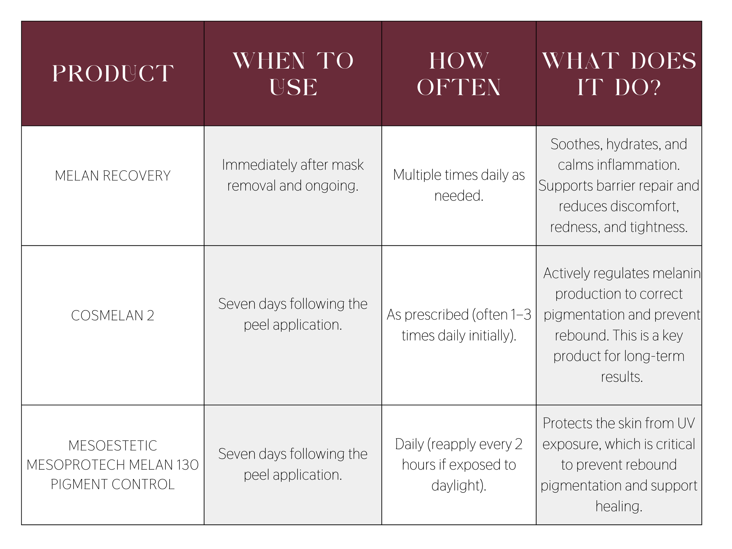 For the first 7 days following your Cosmelan Peel, Melan Recovery is the ONLY treatment product to be applied to the skin.